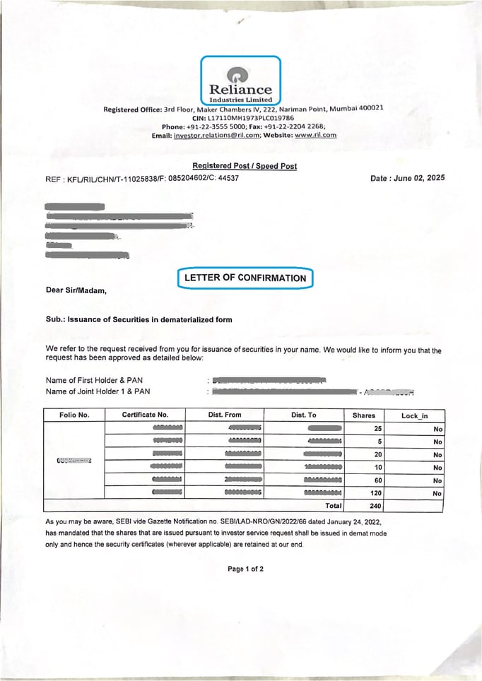 I lost my shares of Reliance Industries Limited and I was finding difficulties to recover the same. I was looking for someone who is professional and familiar with the recovery services. I am so glad I found Deca who helped me with all the documentation throughout the process. They have managed to solve all the obstacles and finally the company has issued a letter of confirmation for my lost shares. I came to know that the same needs to be submitted to the demat section, hence I have approached Deca to open a Demat account and with their help shares got credited into my Demat account. I would like to thank Deca and their recovery team for the excellent service.
